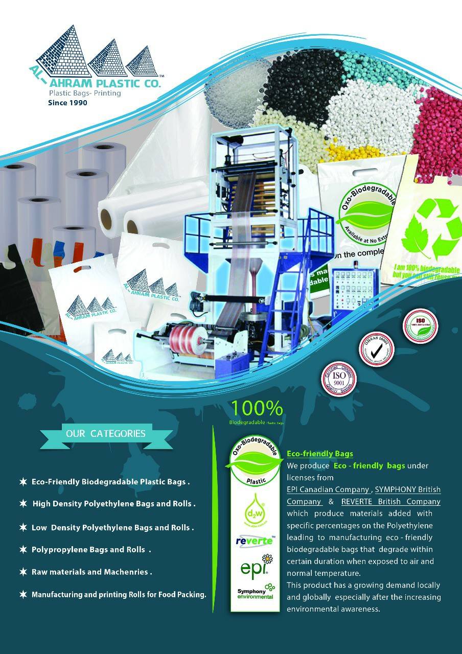 شركة الأهرام لصناعة البلاستيك هي شركة رائدة في مجال الصناعات البلاستيكية في مجال صناعة مواد التعبئة والتغليف ومنتجات المائدة من منتجات البولي ايثلين والبولي بروبلين والبولي اميد ... الخ أحادية وثنائية وثلاثية الطبقات السادة والمطبوعة والتي تخدم كثير من الصناعات الدوائية والغذائية والملابس واللحوم وشركات الشحن .. الخ.